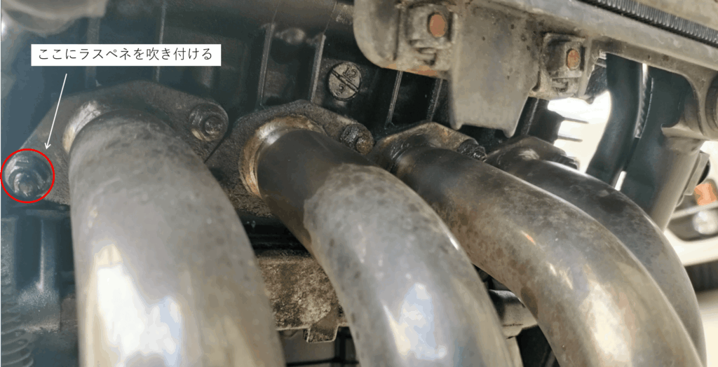 マフラーとエンジンを締結しているナットをはずすためにラスペネをかけて10分くらい放置します。