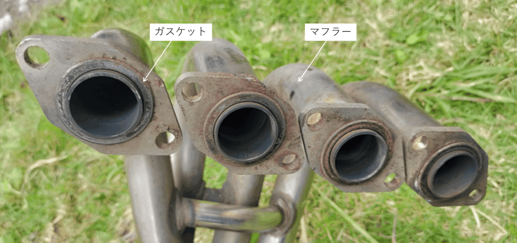 マフラーにはガスケットと呼ばれる部品がついています。エンジンとマフラーの間に挟まっており、締結により潰れて隙間をうめて排気漏れを防ぐ機能があります。こちらは新品に交換して下さい。