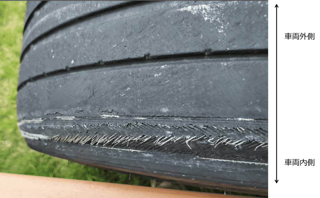 タイヤを確認したところ運転席側タイヤの内側摩耗が激しくワイヤーがでていました💦